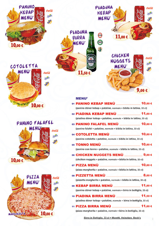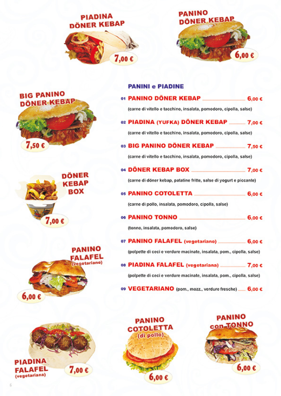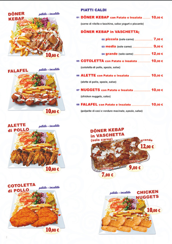 Il ristorante offre menù completi, questo vuol dire che non si può mangiare solo kebap, ma anche tante altre specialità. Si può richiedere il menù vegetariano o il menù bambini, questo comprende cotolette, sempre amate dai piccoli ospiti, patatine, hamburger, pizza e tante altre specialità. Non mancano le insalate sfiziose con mais, tonno, carciofi e pomodori. Tra le specialità vi sono anche le piadine e i panini che possono essere farciti con kebap. Infine c'è il servizio caffetteria.