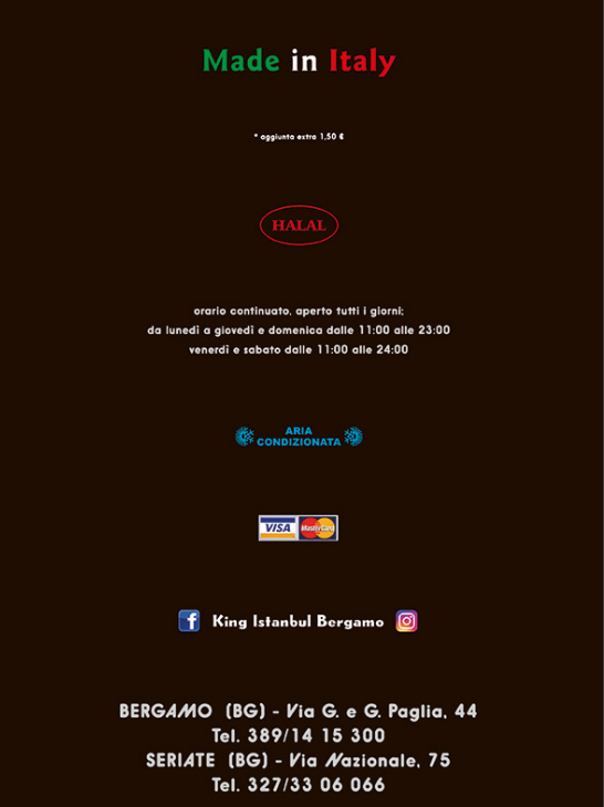 Il Ristorante Pizzeria King Istanbul Turkish Kebap a Bergamo è un locale specializzato in cucina turca, tutti i piatti sono preparati esclusivamente con carni 100% italiane lavorate nel proprio laboratorio di Pedrengo. Oltre a proporre kebap e altre specialità della cucina Turca, offre ai clienti anche tanti piatti tipici della cucina italiana, diventa così il ristorante ideale per una cena tra amici, per trascorrere momenti piacevoli all'insegna della buona tavola.